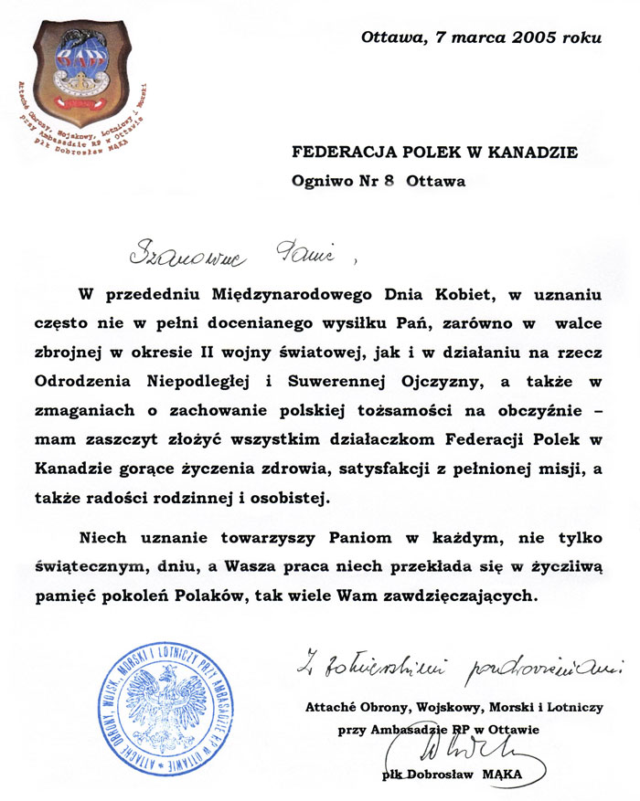 - List Attaché Obrony przy Ambasadzie RP płk Dobrosława Mąki,